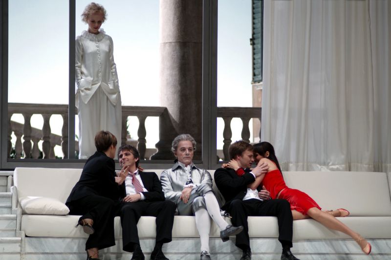 Gefährtin Despina (Kerstin Avemo, stehend) wacht über Dorabella (Paola Gardina, li.), Ferrando (Juan Francisco Gatell, 2.v.l.), Don Alfonso (William Schimell, Mi.), Guglielmo (Andreas Wolf, 2.v.r.) und Fiordiligi (Anett Fritsch, re.) (Foto: ARTE France / © Javier del Real)
